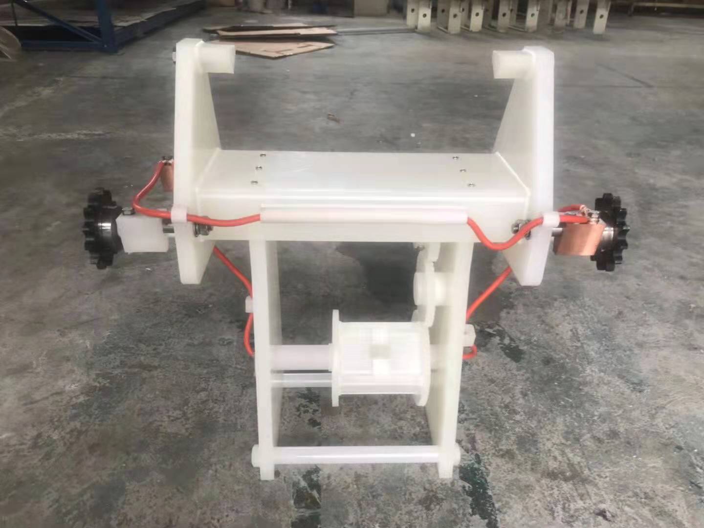 ①一般為一體式即下麵為(wéi)轉動滾(gǔn)筒,上麵為傳動(dòng)部(bù)分和導電鉤子;此種製作一般承載重量不是很重的情況下(xià)(介於②和③之間的重量)