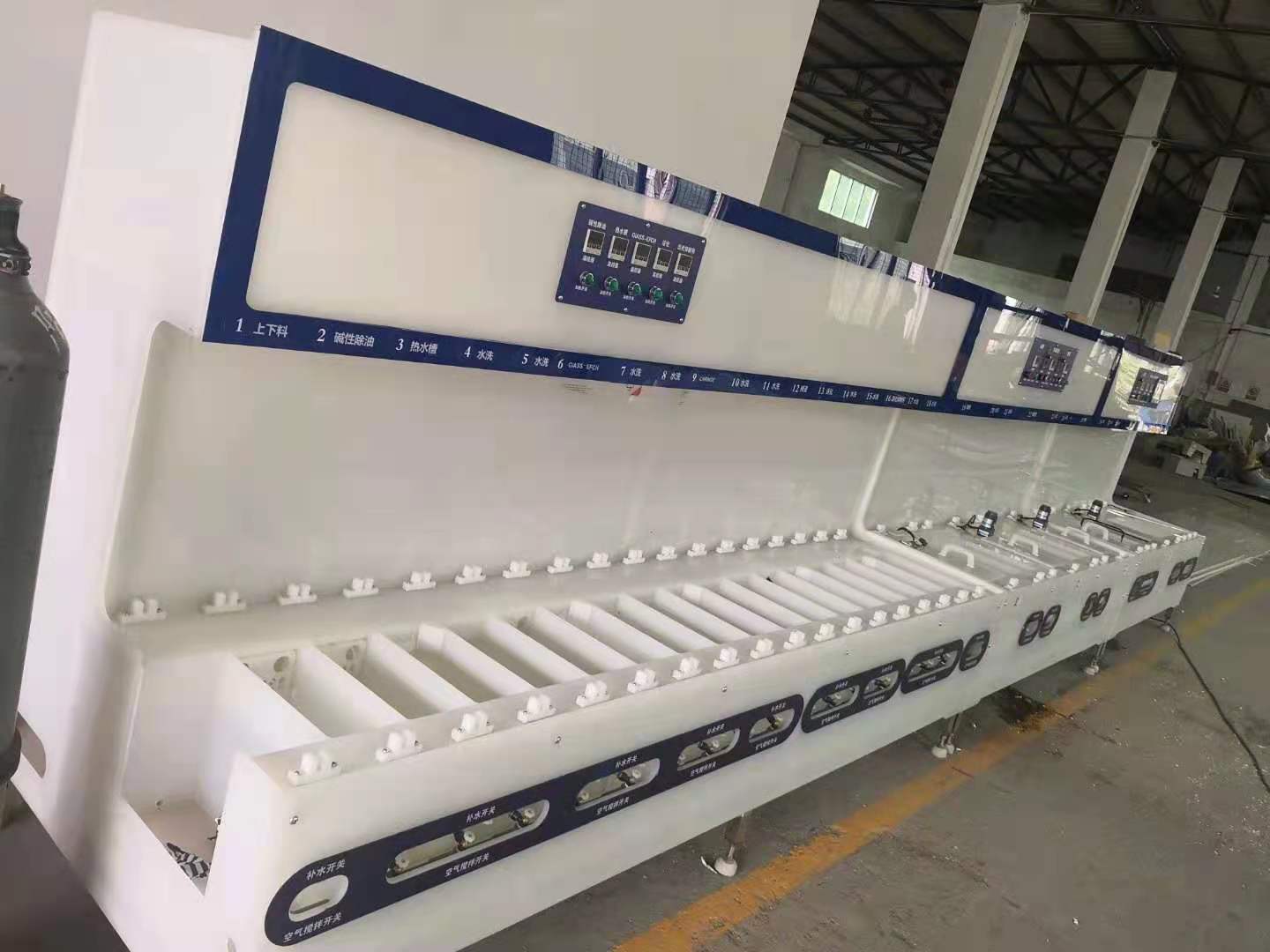 電鍍處理過(guò)程中所用的設備主要有各類固定槽(cáo)、滾鍍槽、掛具(jù)、吊籃等。鍍後處理是對零件進行拋光、出光(guāng)、鈍化(huà)、著色(sè)、幹燥、封閉、去氫等工作(zuò),龍門式掛(guà)鍍(dù)生產(chǎn)線,根據需要選用其中一(yī)種或數種工序使零件符合質量要求。鍍後處理常用設備主要有磨、拋光機,各類固(gù)定槽。全自(zì)動(dòng)環形垂直升降電鍍流水線